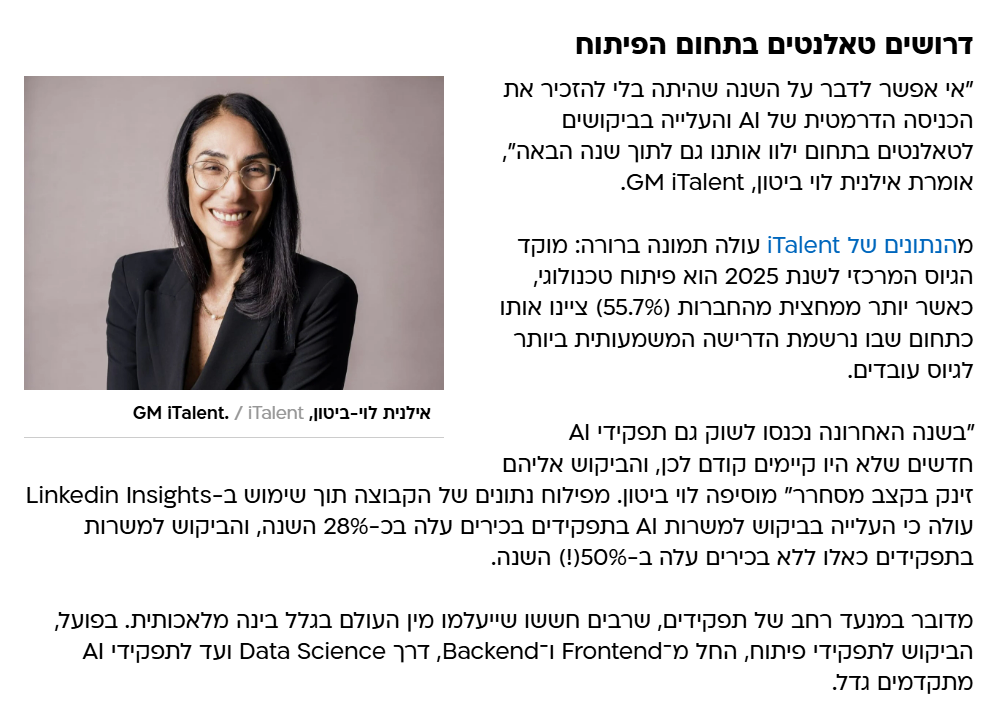בסקירה השתתפו אילנית לוי ביטון, GM של iTalent, וליטל ירון, GM של iLeadX, חברת ה–Executive Search של הקבוצה.
